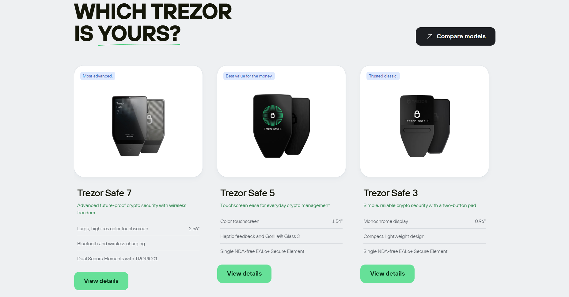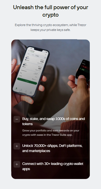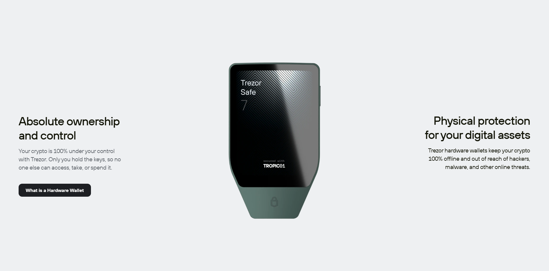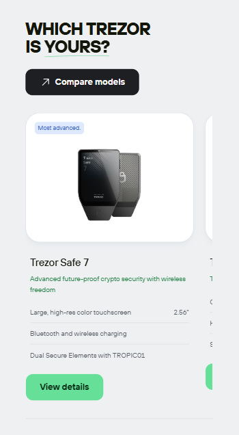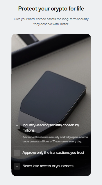 Trezor is built with open source security, with fully transparent code reviewed by experts around the world. Unlike custodial wallets or exchanges, Trezor offers true cold storage with offline keys that never leave your device.Features like optional passwords, phishing protection, community verification, and Tropic01 – the world’s first transparent and auditable Secure Element – offer next-generation protection specifically designed for self-care. And the new Trezor Safe 7, the first hardware wallet with quantum-ready security, gives cryptocurrency owners the strongest foundation for safe and independent control of their assets in the future.