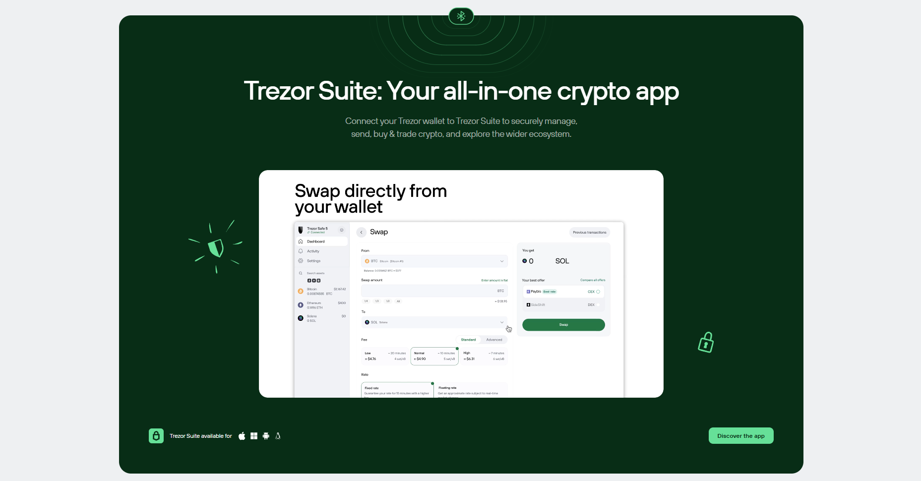 With Trezor, pricing is completely transparent, which means there are no hidden fees or surprise fees. When you buy, sell, or exchange cryptocurrencies in Trezor Suite, you can always see the total cost up front and choose the best available offer, with support for local payments where possible. When you send cryptocurrency, you only pay the standard transaction fee, which goes to the network (e.g. Bitcoin miners or Ethereum validators), and not to Trezor.